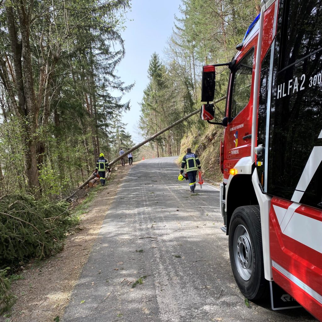 Kurze Zeit später rückten wir mit dem HLFA2 zum Einsatzort aus. Vor Ort stellte man fest, dass ein Baum umgestürzt war und über die Fahrbahn ragte. Nach dem Absichern der Einsatzstelle wurde der Baum mit der Motorkettensäge zerkleinert und von der Straße entfernt. Anschließend wurde noch die Fahrbahn gereinigt, ehe man die Einsatzbereitschaft wiederherstellen konnte.
