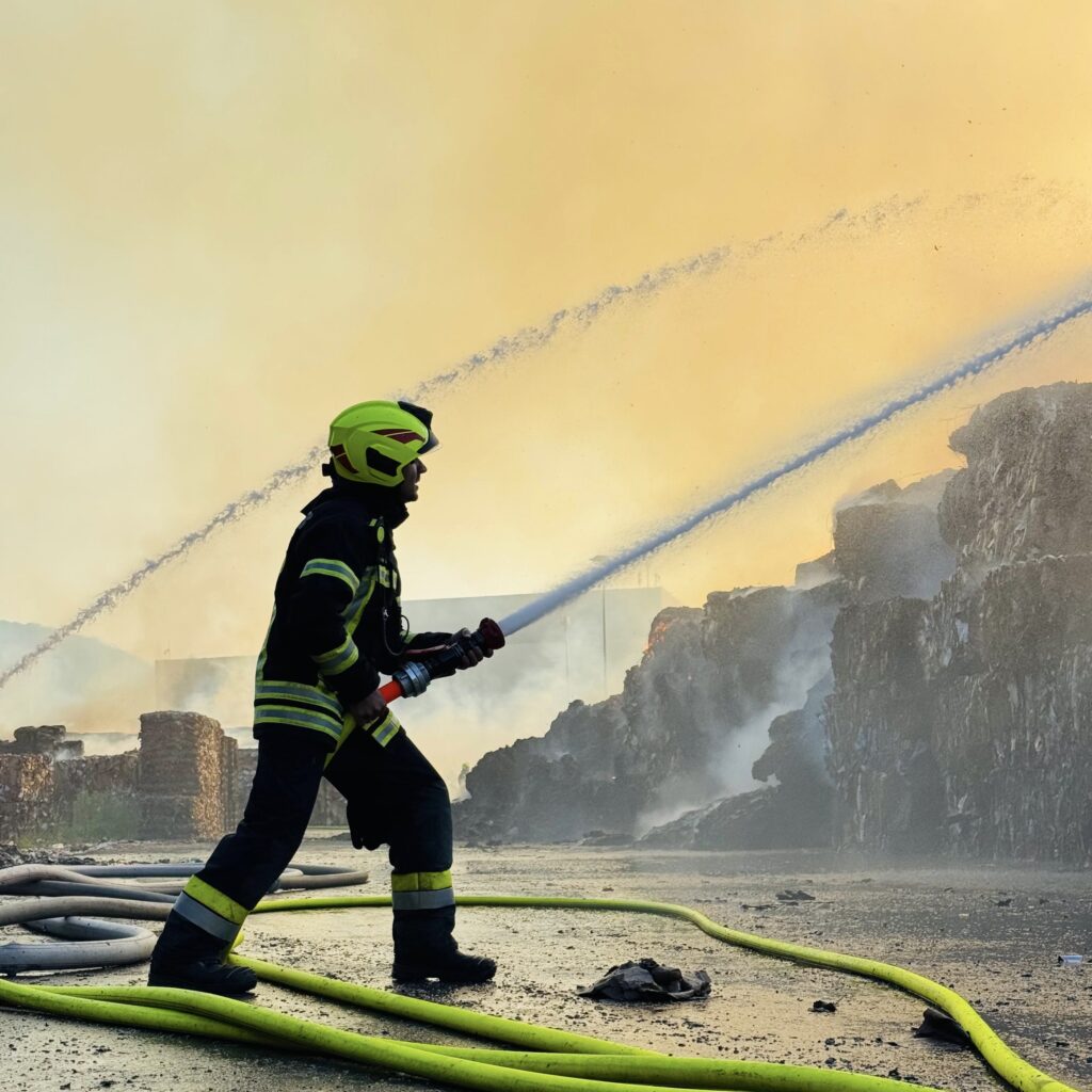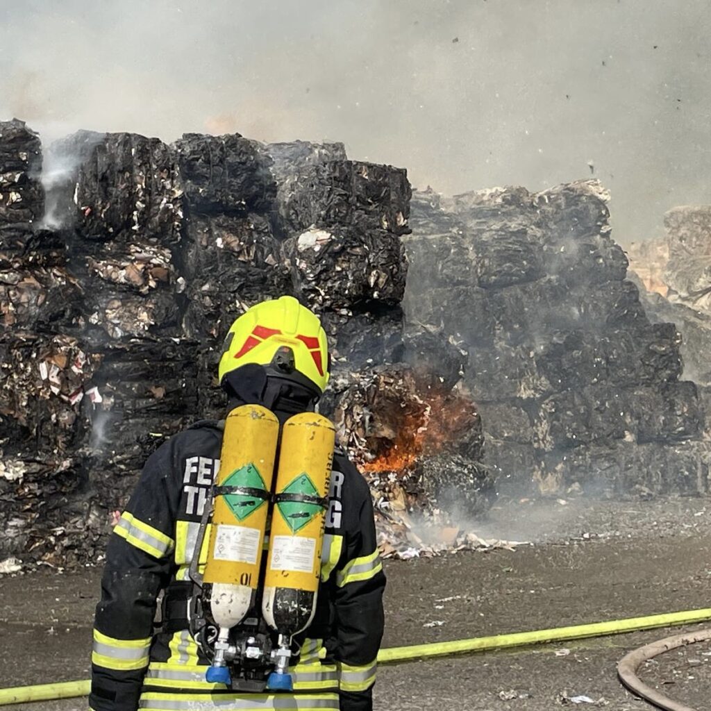 Unsere Atemschutzgeräteträger begaben sich zum Sammelplatz, von wo aus sie in mehreren Durchgängen in das Innere des Lagers geschickt wurden. Dort führten sie gezielte Löschmaßnahmen durch und verhinderten ein Übergreifen der Flammen auf weitere Werksteile. Insgesamt kamen 11 unserer Atemschutzgeräteträger bei dieser äußerst kräfteraubenden Tätigkeit mehrfach zum Einsatz.