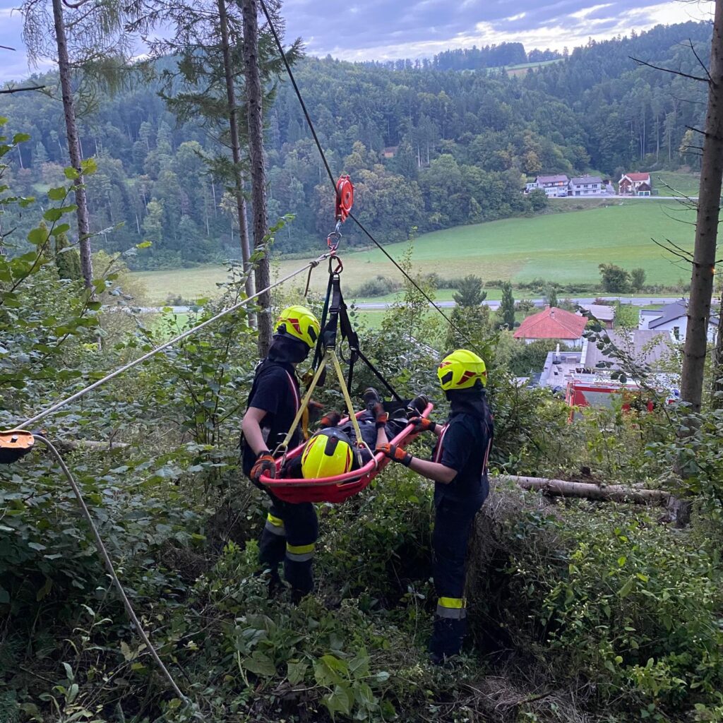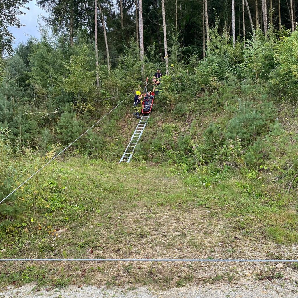 Übungsannahme war eine verletzte Person im Wald, die mithilfe einer Schleifkorbtrage aus steilem Gelände gerettet werden musste. Eine weitere Person blieb während der gesamten Rettung zur Betreuung und Versorgung neben der Trage.