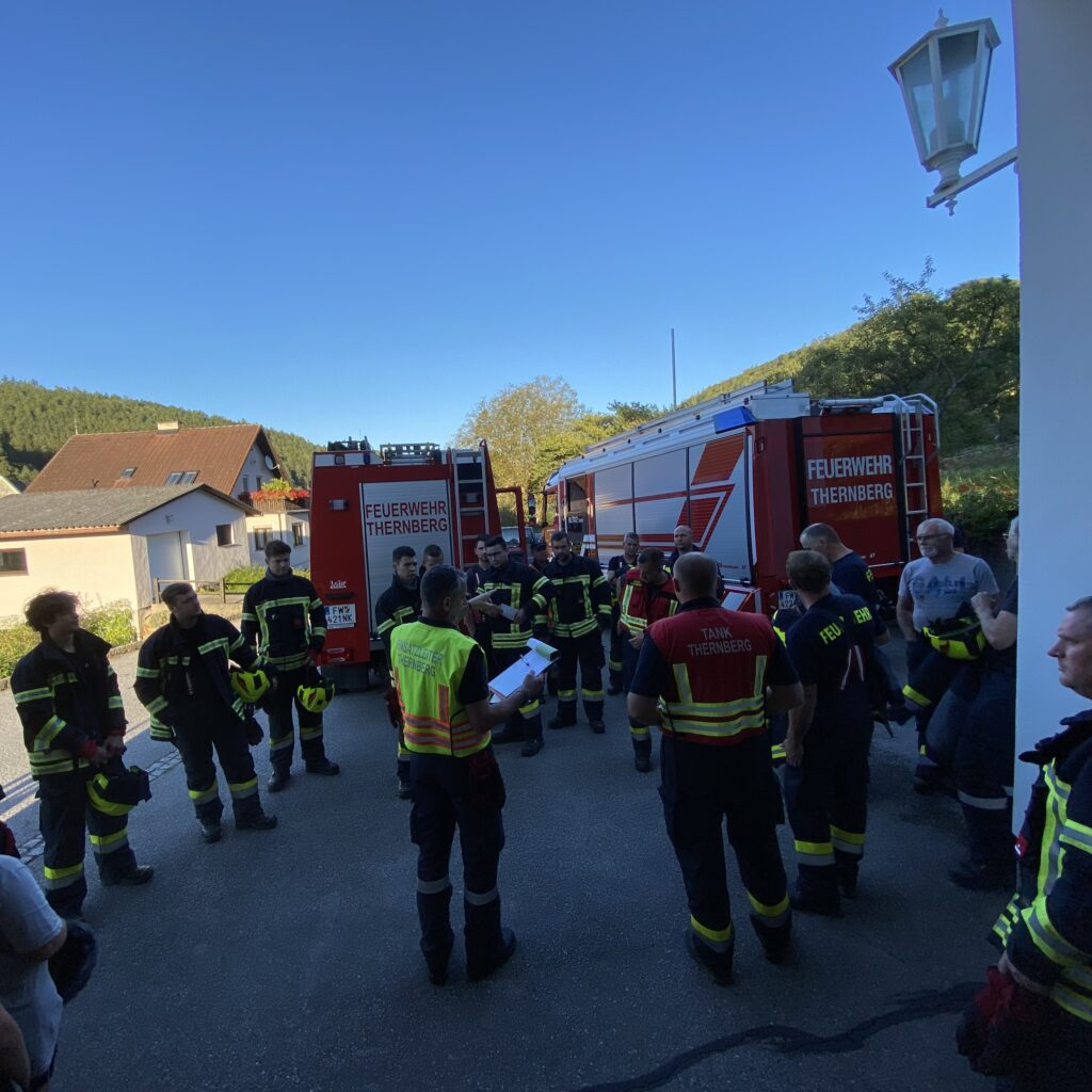 Die Feuerwehr Thernberg nahm mit beiden Fahrzeugen und 24 Mitgliedern an der Übung teil. Insgesamt standen 9 Feuerwehren mit 14 Fahrzeugen und rund 80 Mitgliedern im Übungseinsatz.