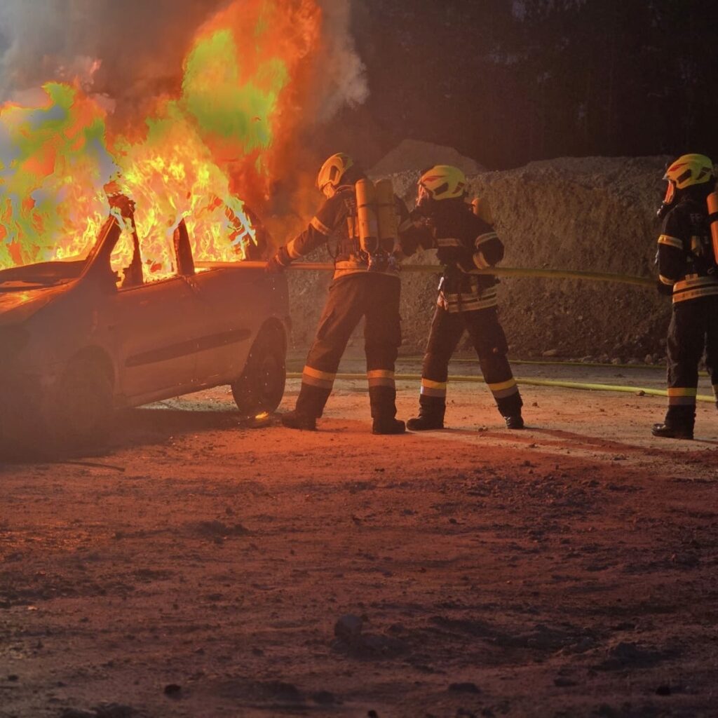 Übungsannahme war ein in Brand geratenes Fahrzeug, das unter Atemschutz gelöscht werden musste. Die Übung wurde realitätsnah mit echtem Feuer durchgeführt.