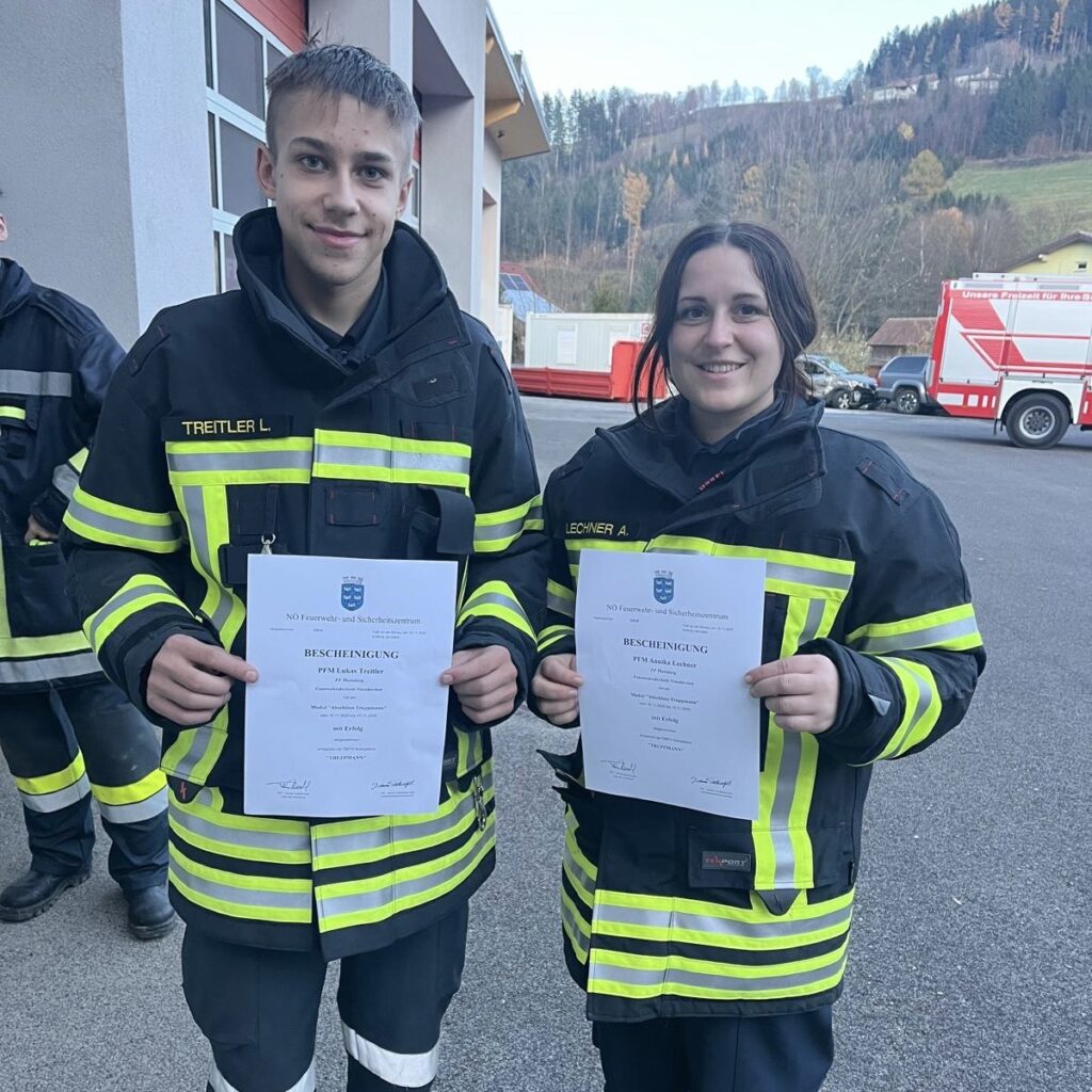 Von Freitag, dem 14.11.2025, bis Sonntag, dem 16.11.2025, absolvierten 2 Mitglieder der Feuerwehr Thernberg die Basisausbildung in Aspang Markt und sind nun vollausgebildete/r Feuerwehrfrau/-mann.